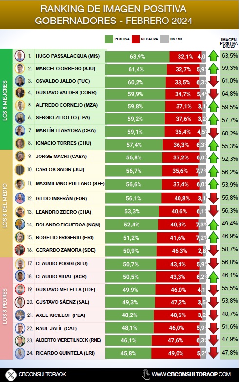 CB Consultora informó que los tres gobernadores mejor valorados del mes de febrero de 2024 fueron Hugo Passalacqua de la provincia Misiones con 63,9%; en segundo lugar, quedó Marcelo Orrego de San Juan con 61,4% de imagen positiva; y cerró este podio Osvaldo Jaldo de Tucumán con 60,2% de imagen positiva.