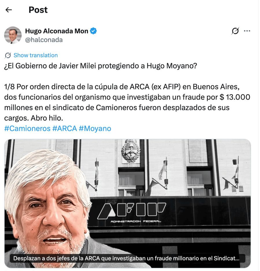 Una serie de movimientos internos en la cúpula de ARCA (ex AFIP) ha encendido las alarmas sobre un posible pacto de no agresión entre el Poder Ejecutivo y el sindicato de Camioneros. Según la investigación revelada por Hugo Alconada Mon, dos jefes de fiscalización de la Regional Mar del Plata fueron desplazados de sus cargos tras negarse a congelar una investigación por fraude millonario que involucra directamente a la estructura de Hugo Moyano.
