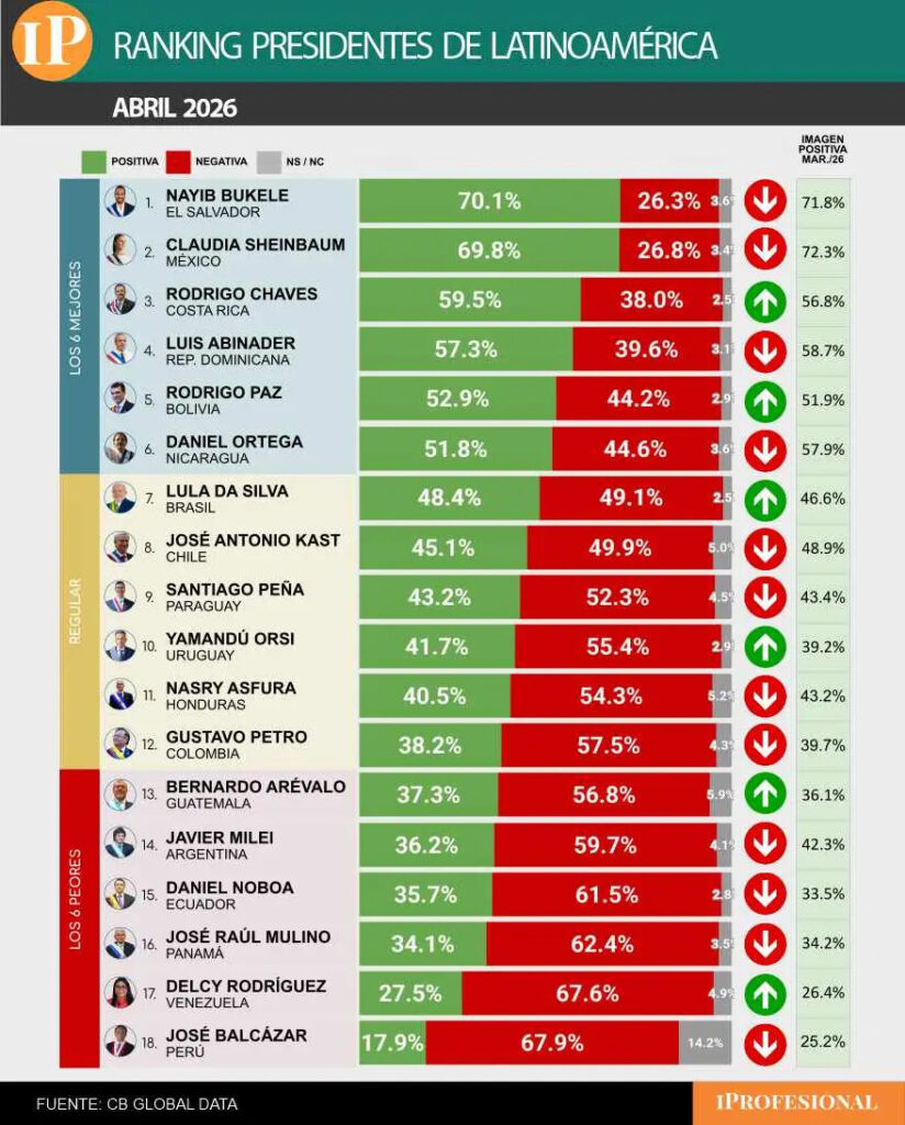En cambio, en abril Milei fue superado por sus pares sudamericanos Rodrigo Paz (Bolivia), que ocupó el quinto puesto y apareció entre “los 6 mejores” con 52,9%; Lula Da Silva con 48,4%; el chileno José Antonio Cast con 45,1%; el paraguayo Peña con 43,2%; el uruguayo Orsi con 41,7% y el colombiano Gustavo Petro con 38,2%, ubicados en las posiciones 7,8,9,10 y 12, respectivamente.