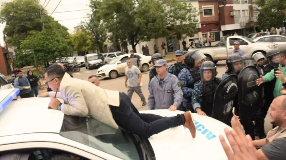 En medio de la protesta, varios trabajadores -al ver a la Policía desalojando el lugar- se comportaron de manera violenta. Todo coincidió con la salida de los concejales del edificio de la Cámara de Diputados y fue entonces cuando, violando la ley e incitando al desorden, el concejal del CER, Ángel Sánchez, se subió al patrullero, comenzó a golpear el techo de la cabina del vehículo y terminó detenido.