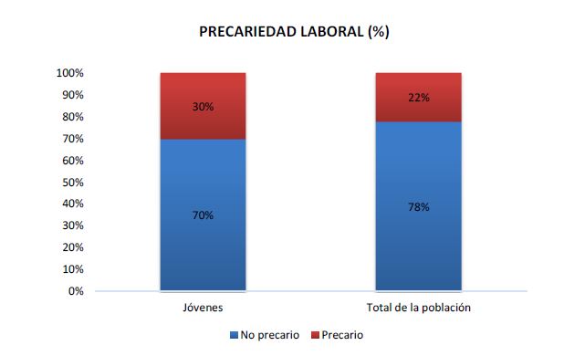El 30% de los jóvenes asalariados se inserta de forma precaria al mercado laboral; en cambio, si se toma el total de la población, este porcentaje desciende al 22,2%. En tanto, entre los jóvenes precarizados, el 63% son varones y el 37% son mujeres.