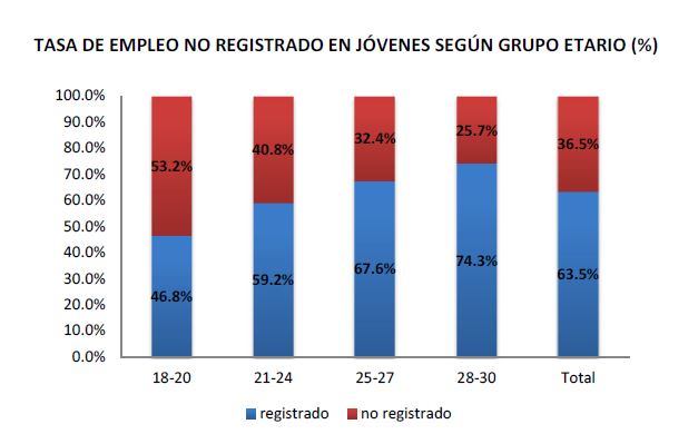 Como contrapartida, el 51,4% de los jóvenes están empleados: el 74% son asalariados y el 21% trabaja por cuenta propia. Sin embargo, la informalidad es uno de los factores predominantes del trabajo joven.