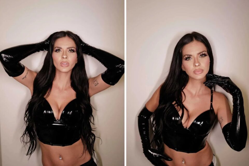 Para grabar el challenge vistió un conjunto total black compuesto por un crop negro con breteles y un escote pronunciado, estilo corset y con detalles de puntilla y encaje. La actriz complementó el look con unos guantes cubriendo completamente los brazos.