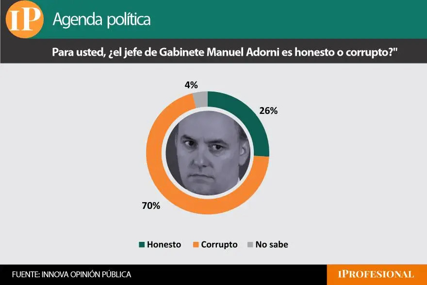 No obstante, al indagar puntualmente en el caso de Adorni, la encuesta realizada por Innova entre el 16 y el 19 de marzo con 1.830 casos efectivos arrojó un resultado lapidario: el 70% consideró que es “corrupto” y solo el 26% lo calificó como “honesto”.