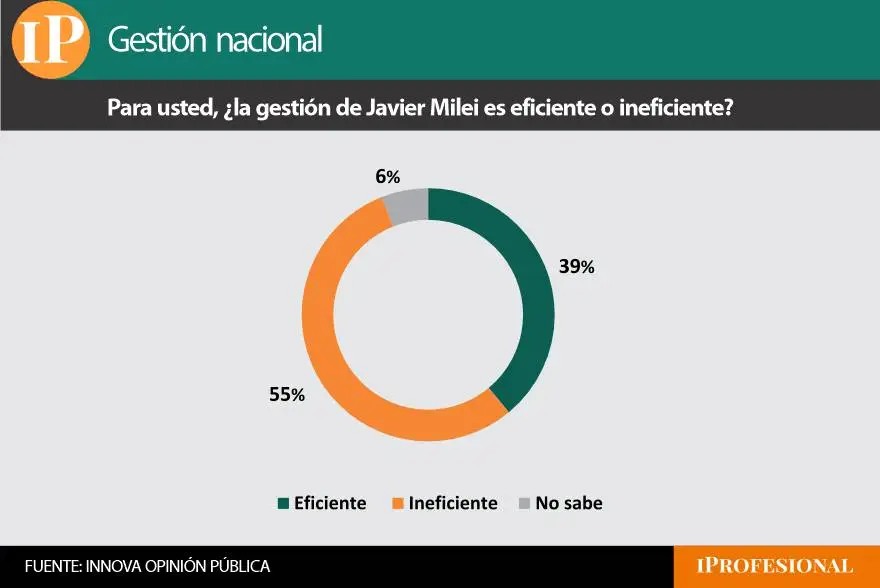 Es difícil determinar si ese revés en la encuesta se debe al caso Adorni o a la situación de cansancio económico, pero el sondeo dio con otros datos que hablan de causas más generales. Por caso, al preguntar sobre el nivel de eficiencia que le otorgan a la gestión de Milei el 39% lo calificó como “eficiente” contra un 55% que lo considera “ineficiente”.