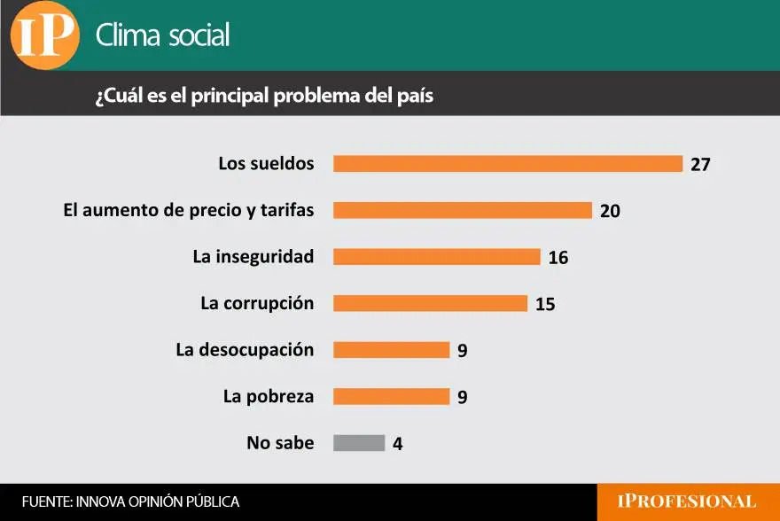 En el primer lugar apareció como problema “los sueldos” con 27% de las respuestas, seguido por “el aumento de precios y tarifas” con el 20%. En tercer puesto quedó la “inseguridad” con 16%.