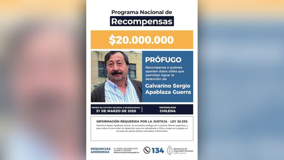 El gobierno nacional, a través del Ministerio de Seguridad, dispuso una recompensa de 20 millones de pesos para las personas que brinden datos útiles que permitan lograr la captura de Galvarino Sergio Apablaza Guerra, el exguerrillero chileno que vivía en la localidad bonarense de Moreno, y que ahora se encuentra prófugo de la Justicia, y al que Chile busca extraditar hace años.