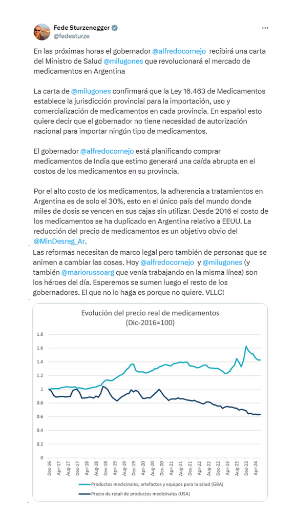 “En las próximas horas el gobernador Alfredo Cornejo recibirá una carta del ministro de Salud, Mario Lugones, que revolucionará el mercado de medicamentos en ArgentinaLa carta de Lugones confirmará que la Ley 16.463 de Medicamentos establece la jurisdicción provincial para la importación, uso y comercialización de medicamentos en cada provincia. En español esto quiere decir que el Gobernador no tiene necesidad de autorización nacional para importar ningún tipo de medicamentos”, dijo en su cuenta de X Sturzenegger.