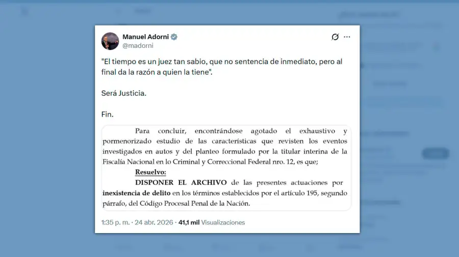 Desde sus redes sociales, Manuel Adorni se expresó ante el alivio que representa este fallo. “‘El tiempo es un juez tan sabio, que no sentencia de inmediato, pero al final da la razón a quien la tiene”. Será Justicia. Fin”, escribió el Jefe de Gabinete, citando el escrito que resuelve el archivo de la causa.