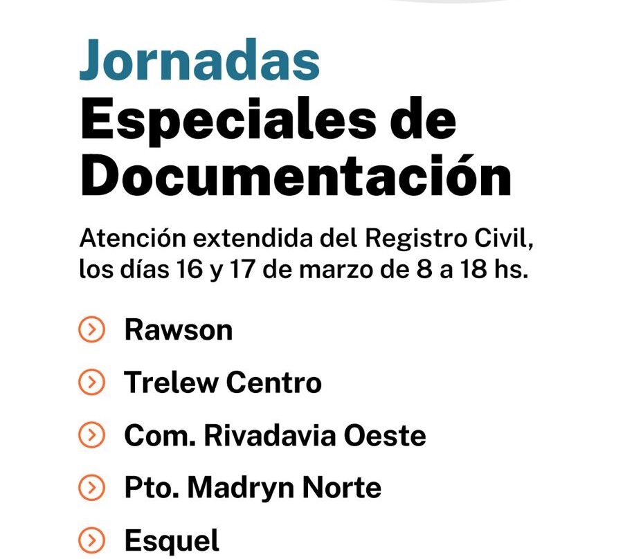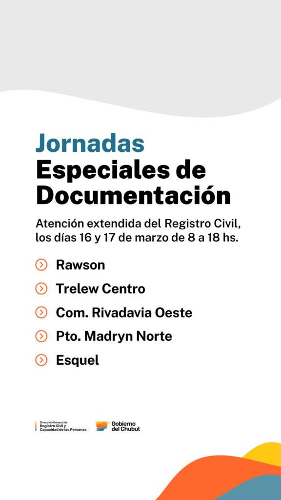 El Ministerio de Gobierno del Chubut informó que las oficinas del Registro Civil de Trelew Centro, Comodoro Rivadavia Oeste, Puerto Madryn Norte, Esquel y Rawson atenderán con horario extendido los días lunes 16 y martes 17 de marzo.