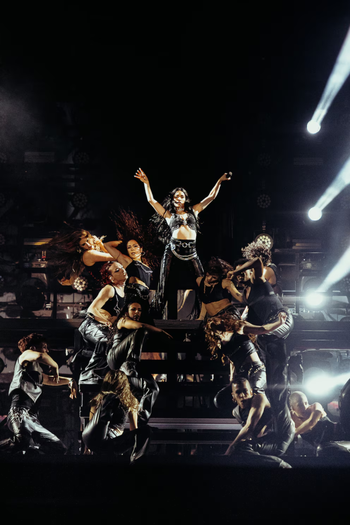 Vestida de negro absoluto, con pantalones acampanados de flecos, un sombrero de cowboy con strass plateado y su melena suelta, se plantó en el centro con una energía feroz. Sus ojos gritaban lo que aún no había dicho con palabras: había vuelto para entregarse por completo. Sonó “Lokura”, el primer tema de su nuevo álbum, y la respuesta fue instantánea. Gritos, saltos, movimientos desbordados. La energía se volvió física. Algunos fans, lookeados con cadenas, medias de red y maquillaje esfumado, replicaban el clima rockero del disco. Cada verso era devuelto por la multitud como un espejo emocional.