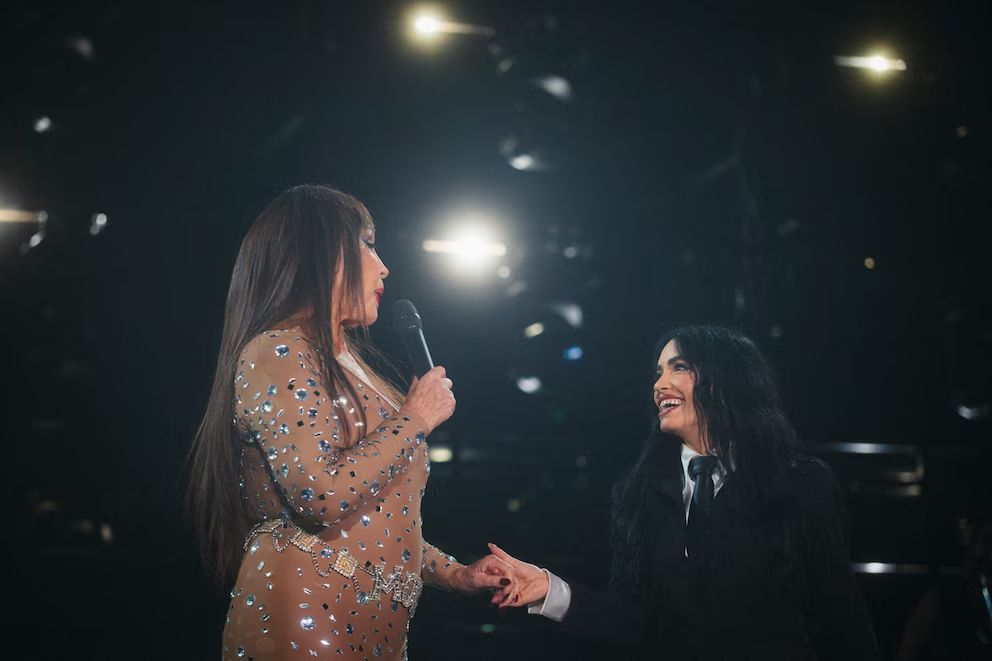 Con sus bailarines volvió a escena tras su primer cambio de vestuario: un body blanco con tajos y transparencias, mientras que siguió con el cabello suelto. Interpretó “Morir de amor” y luego “33”, su colaboración con Dillom, marcada por una coreografía intensa y dramática. El estadio entero estaba rendido a sus pies, aunque todavía le quedaban varias sorpresas a lo largo de aquella velada.Momentos más tarde, una aparición inesperada detuvo todo: Moria Casán. La One, vestida con un body semitransparente y piedras azules, emergió en escena para cantar “¿Quiénes son?”, el tema que comparte con la artista. “¡Aplauso para esta gladiadora del pop!”, gritó la exvedette luego de ver el performance de su compañera, quien estuvo a su lado luciendo un traje negro con una corbata a juego. Y, divertida por el recibimiento al público ante la colaboración que llevaron a cabo dos años atrás, agregó: “Por primera vez en la vida me cuelgo de alguien”. Esto no solo generó la ovación del público, sino también la emoción de la cantante, quien aprovechó para darle un fuerte abrazo luego de agradecerle por su paso por el escenario.