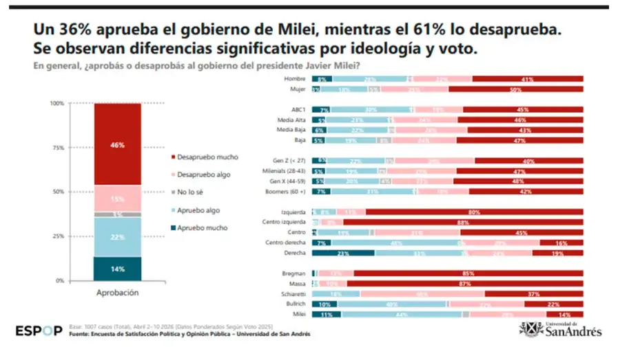 La aprobación del gobierno de Javier Milei se sitúa en un 36% en el mes de abril, lo que representa una baja de tres puntos respecto del 39% registrado en marzo. En el mismo sentido, la desaprobación subió al 61%, lo que consolida una trayectoria de desgaste para la administración central.