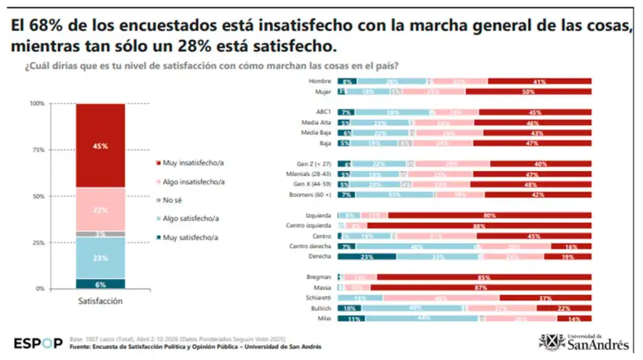 La satisfacción con la marcha general de las cosas cayó al 28%, el nivel más bajo desde el inicio del mandato de Javier Milei en diciembre de 2023. Este dato implica una baja de 5 puntos porcentuales frente al 33% que el estudio capturó en el mes de marzo. Actualmente, la insatisfacción con el rumbo de los asuntos públicos alcanza al 68% de los ciudadanos consultados en todo el país.