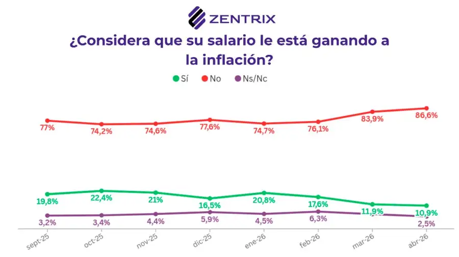 El informe muestra que el deterioro del poder adquisitivo sigue siendo uno de los principales factores de malestar social. El 86,6% de los consultados afirmó que su salario no le gana a la inflación, el peor registro de la serie reciente de Zentrix. En enero, ese indicador había sido del 74,7% y en marzo se había ubicado en 83,9%.