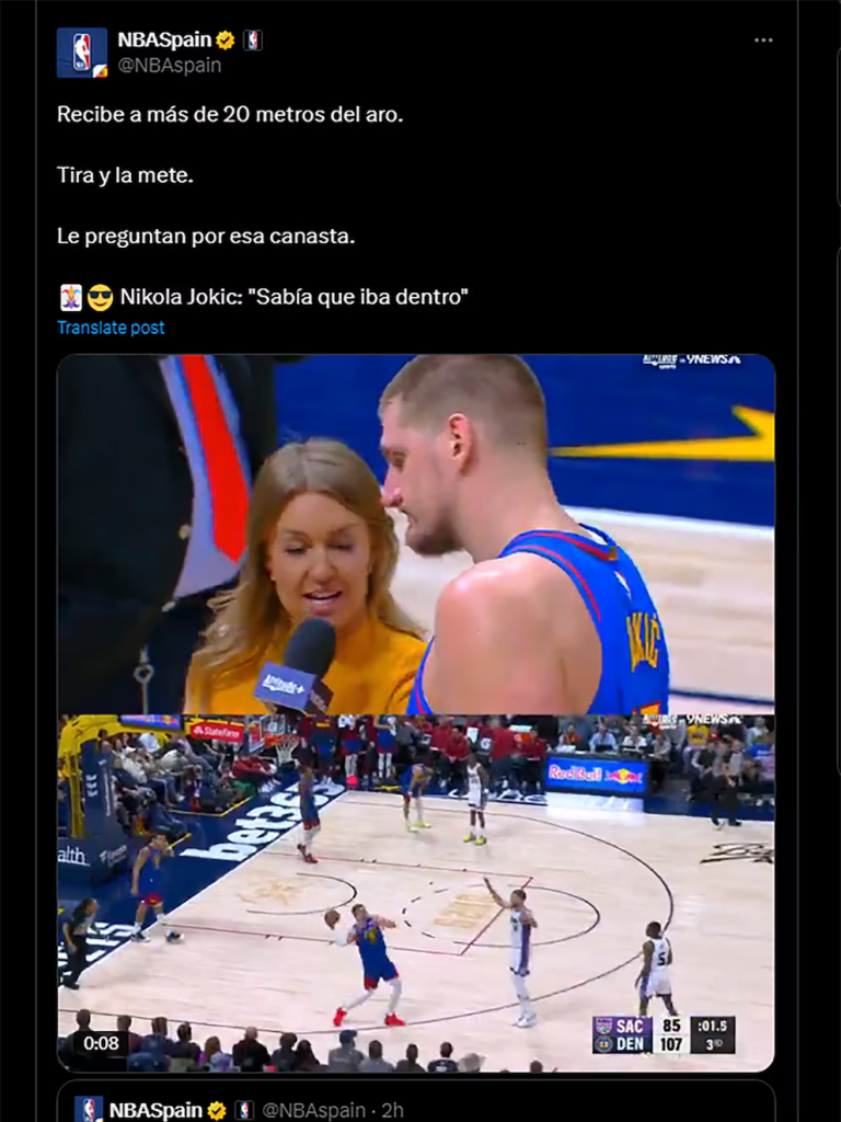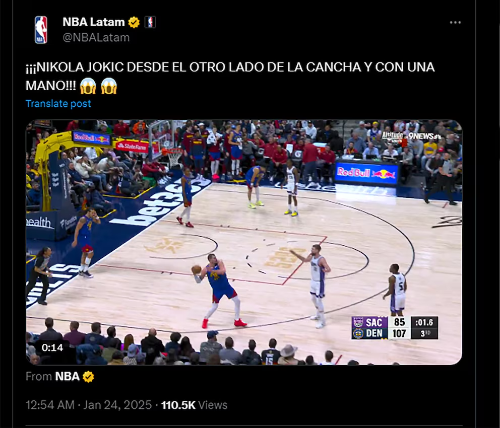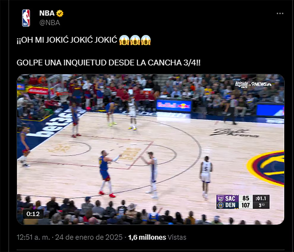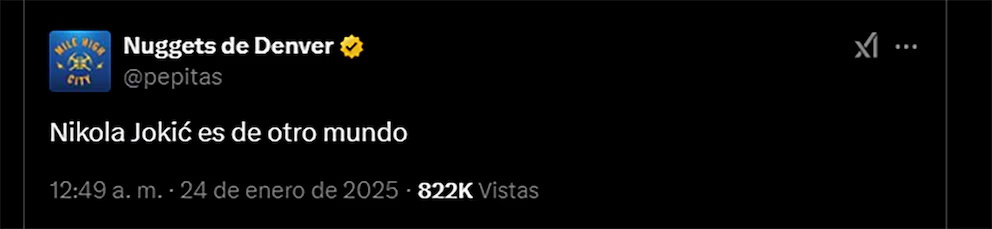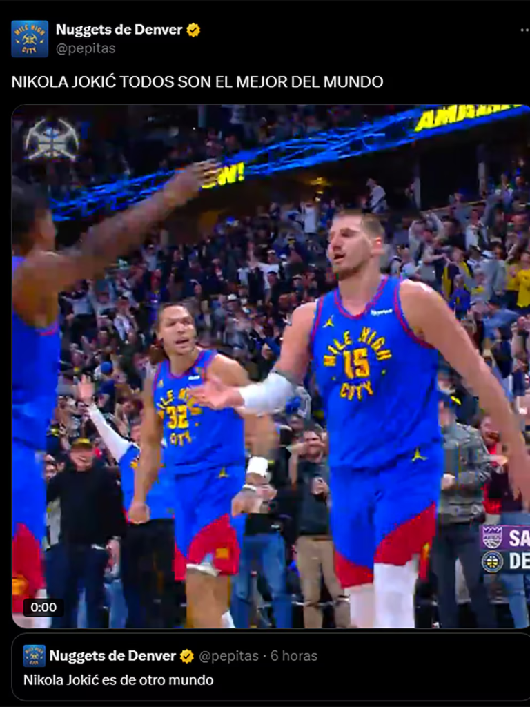 La cuenta oficial de X de la franquicia de Colorado enloqueció con esta jugada y no dudó en deshacerse en elogios con el Joker. “Es el mejor del mundo” y “Nikola Jokić está fuera de este mundo”, manifestaron.Los mensajes de la cuentaLos mensajes de la cuenta oficial de Denver