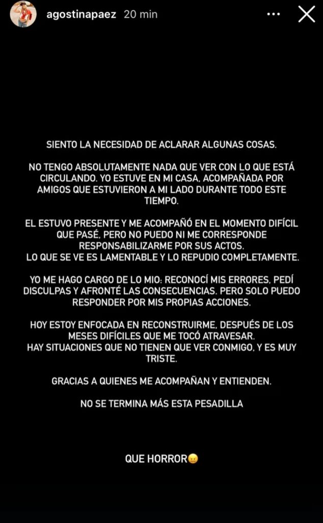 Agostina, también emitió un mensaje a través de sus redes sociales tras el video de su padre y aseguró que ella no estaba en ese momento ni se responsabilizaba por lo que el padre hacía.
