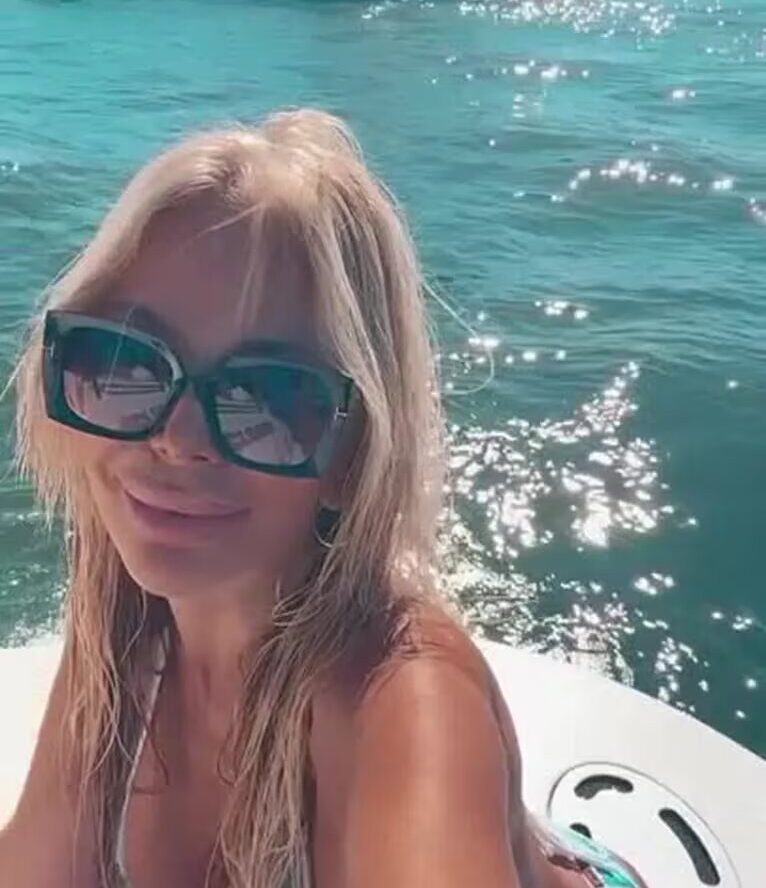 La exvedette se filmó desde un yate en el medio del mar con una microbikini estampada en blanco y celeste. El diseño textil de la pieza es abstracto y simula manchas de acuarela.