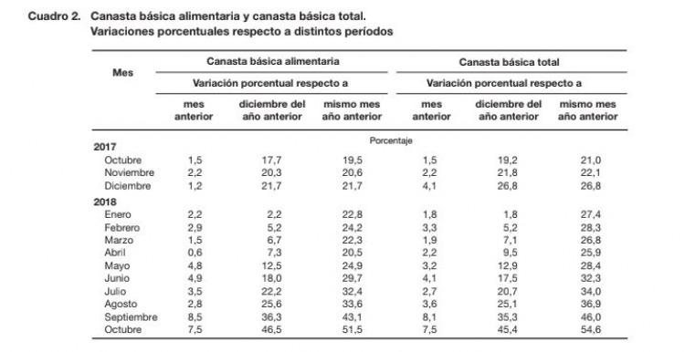 En los 10 meses que van del año, la canasta básica para que una familia no sea pobre subió un 45,4%, mientras que aumentó un 46,5% en el caso de la posibilidad de evitar la indigencia. Esto se debe al mayor peso de alimentos y servicios públicos sobre los más pobres dentro del espectro, ya que los mismos dedican una mayor proporción de los gastos en alimentos y servicios públicos.