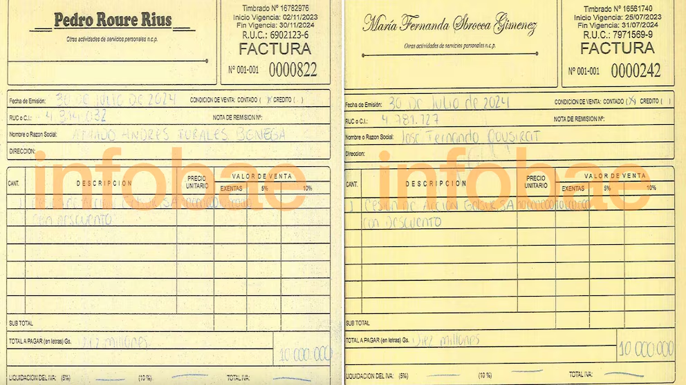 Los documentos a los que tuvo acceso Infobae revelan que por la venta de las acciones se habrían pagado 24 millones de guaraníes (12 millones por cada mitad), aunque se confeccionaron dos facturas por 20 millones (10 millones cada una). “El valor nominal de cada acción es de 12 millones, el precio de venta fue de 10 millones por cada una de las dos acciones integradas”, explicó Roure Rius.