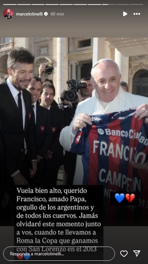 Marcelo Tinelli recordó un episodio cargado de simbolismo futbolístico y afectivo. Publicó una fotografía en la que aparece junto al Papa, quien sostiene una camiseta de San Lorenzo, club del cual ambos son simpatizantes. El conductor escribió: “Vuela bien alto, querido Francisco, amado papa, orgullo de los argentinos y de todos los cuervos. Jamás olvidaré este momento junto a vos, cuando te llevamos a Roma la copa que ganamos con San Lorenzo en 2013”.