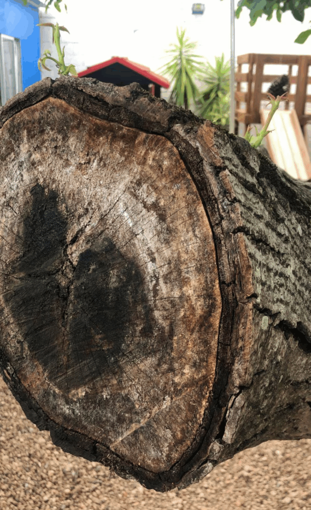 El nogal en el colegio de Montevideo donde trabaja María. La rama que cortaron cuando murió César, su marido, quedó así, con un corazón estampado y nuevos brotes sobre la corteza
