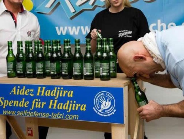 Ahmed Tafzi, en Hamburgo, Alemania, logró quitar 24 tapas en un minuto con su cabeza.