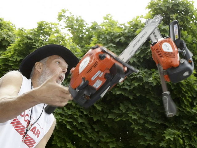 Milan Roskopf juega con sus sierras eléctricas: tiró 62 veces sus tres sierras batiendo su propio récord anterior de 35 veces.