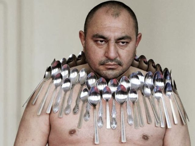 Etibar Elchiyev es el hombre que puede absorber más cucharas con su cuerpo: fueron 50.