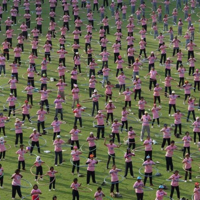 Ocurrió en Febrero del 2013, en la Universidad Nacional  de Ciencia Política de Bangkok, Tailandia: 4483 personas giraban sus hula-hoops al mismo tiempo.