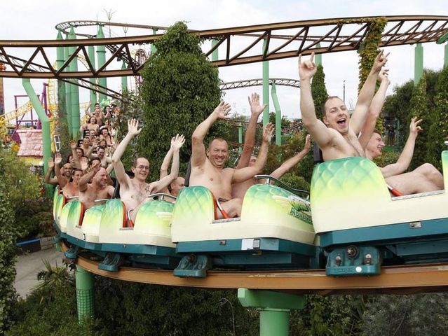 102 hombres desnudos se subieron a una montaña rusa juntos creando un nuevo récord mundial.
