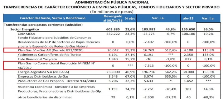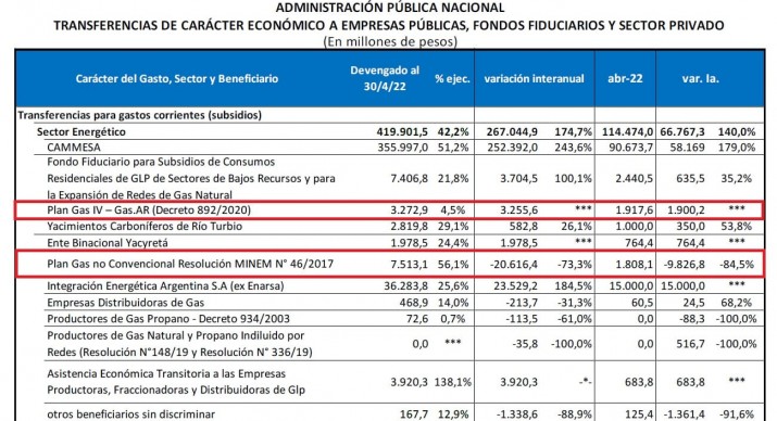 Los datos de La Asociación Argentina de Presupuesto y Administración Financiera Pública (ASAP) informó que durante el primer cuatrimestre del año el Gobierno nacional entregó a las operadoras petroleras 20.042 millones de pesos en concepto de subsidios por intermedio del Plan Gas IV.