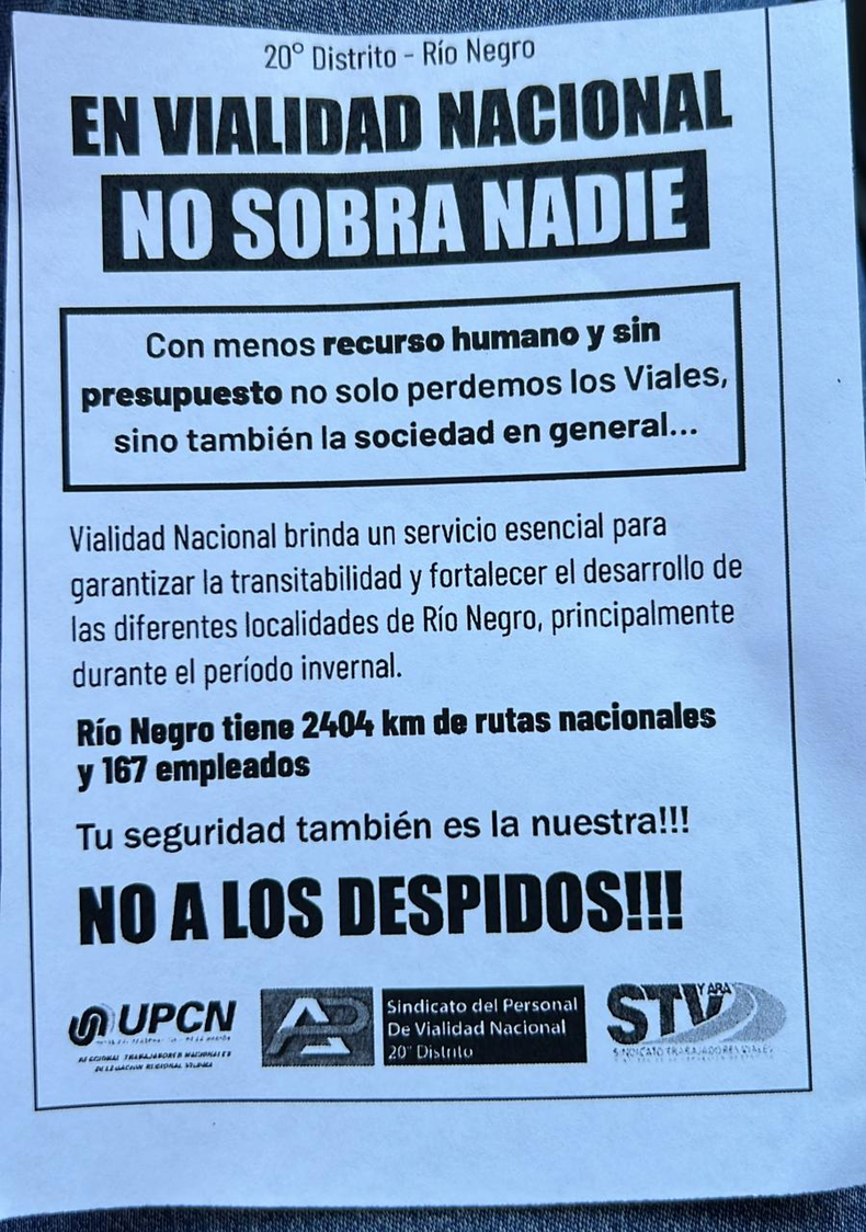 La motosierra y los despidos llegaron a Viedma, donde se asienta la oficina central de Vialidad Nacional en el distrito (N°20). En las últimas horas, se conoció el despido de la planta trabajadora, que manifestó preocupación por el destino de los cesanteados y el mantenimiento de las rutas en los días más fríos del año.