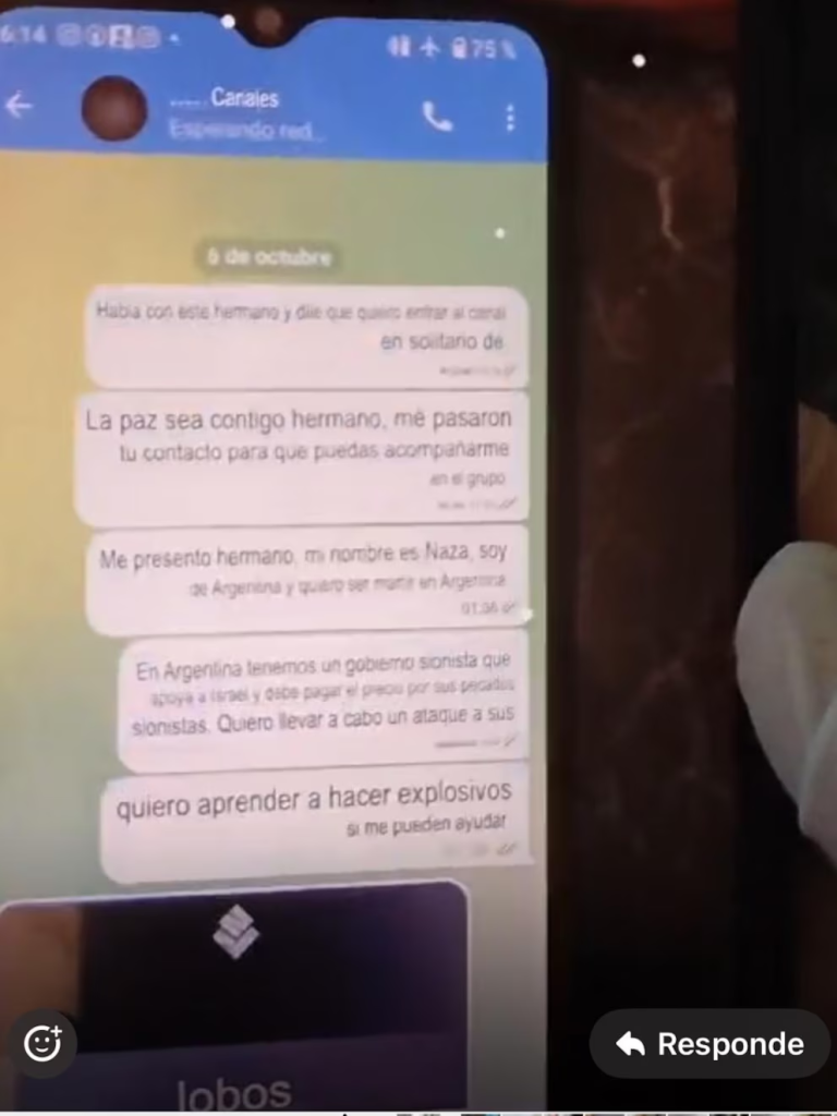 “La paz sea contigo hermano. Me pasaron tu contacto para que puedas acompañarme en el grupo. Mi nombre es Naza soy de Argentina”, se presenta ante una persona, presuntamente, vinculada a una organización terrorista.