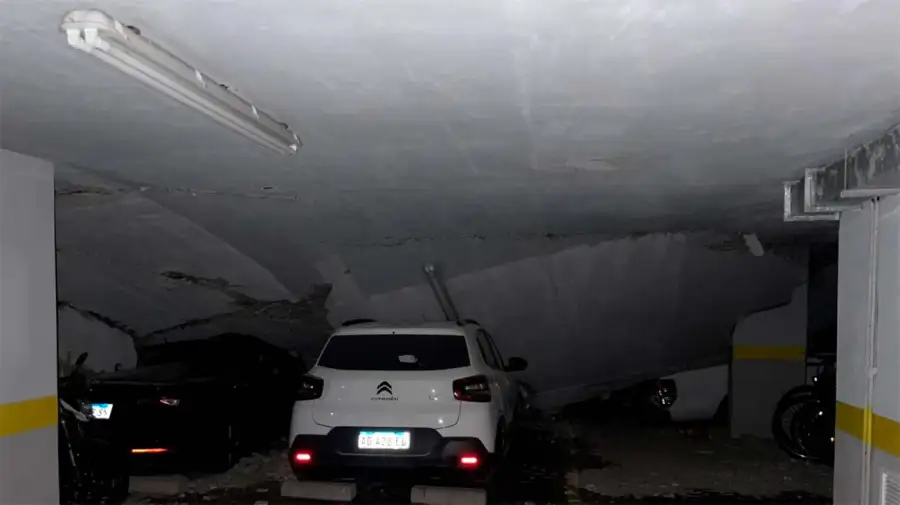 La edificación tiene tres pisos y se desplomó el techo del estacionamiento en el subsuelo. Decenas de autos quedaron aplastados.