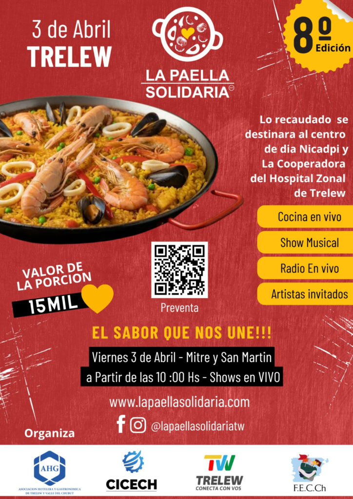 El valor de la porción de paella se fijó en 15 mil pesos y lo recaudado estará destinado al Centro de Día Nicadpi y a la Cooperadora del Hospital Zonal de Trelew, dos instituciones que cumplen un rol fundamental en la comunidad. Se espera poder vender mil porciones.
