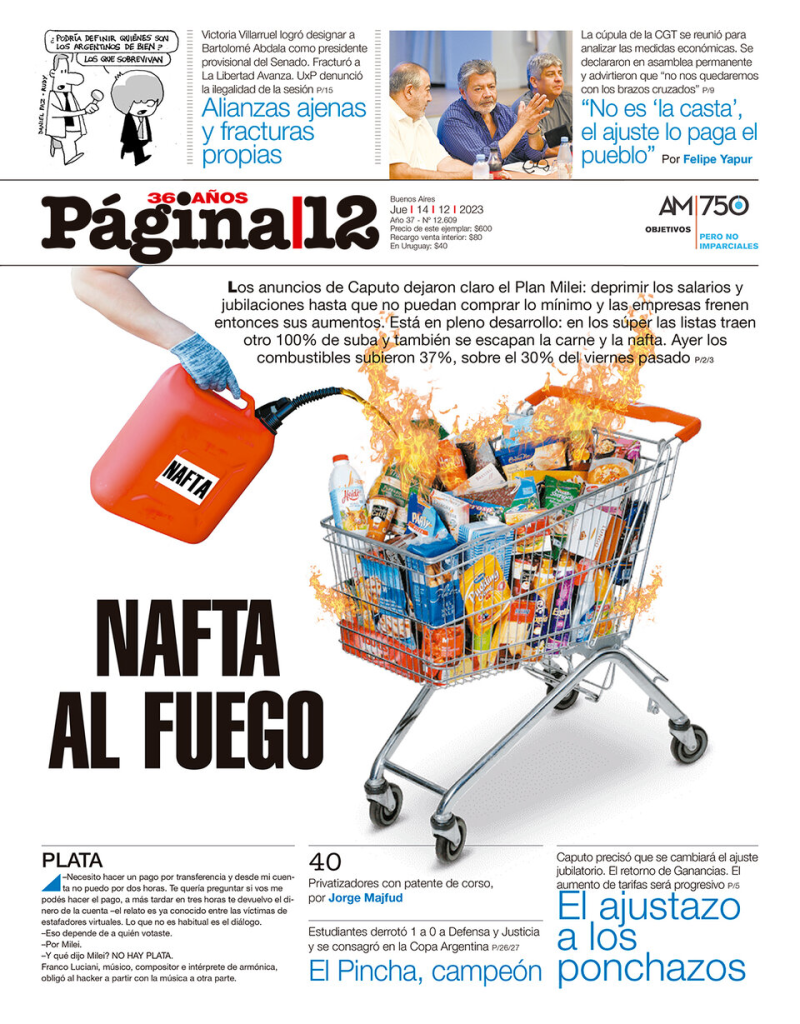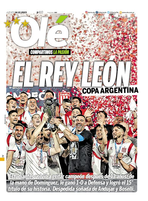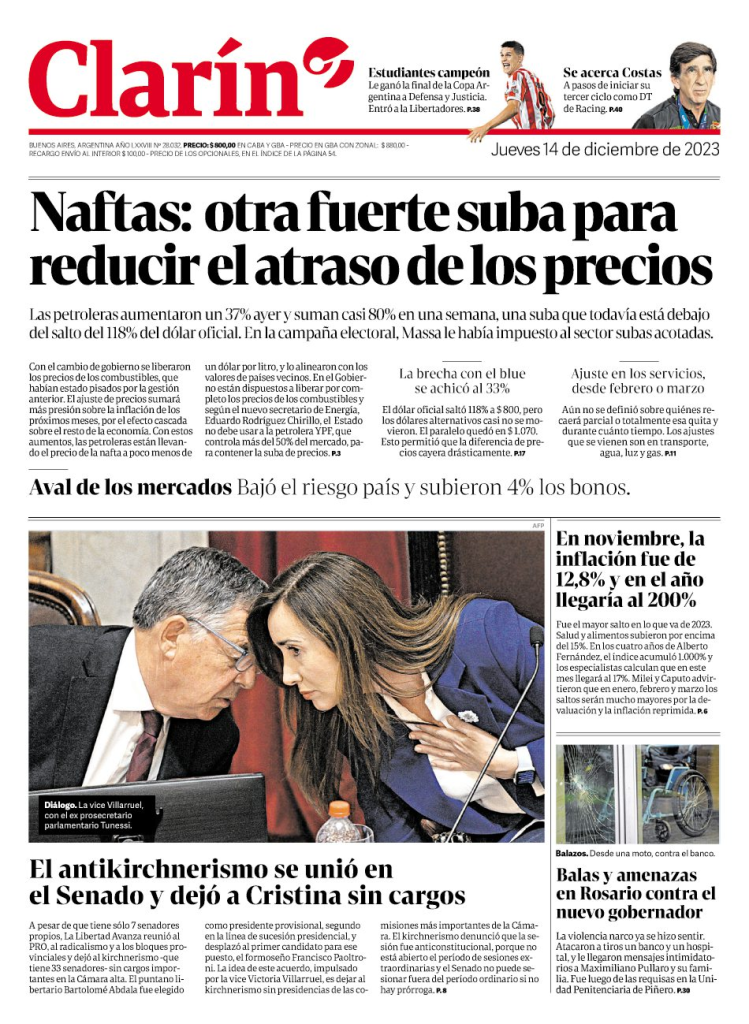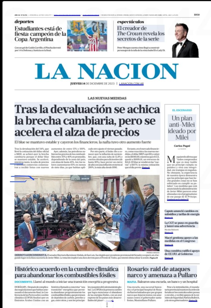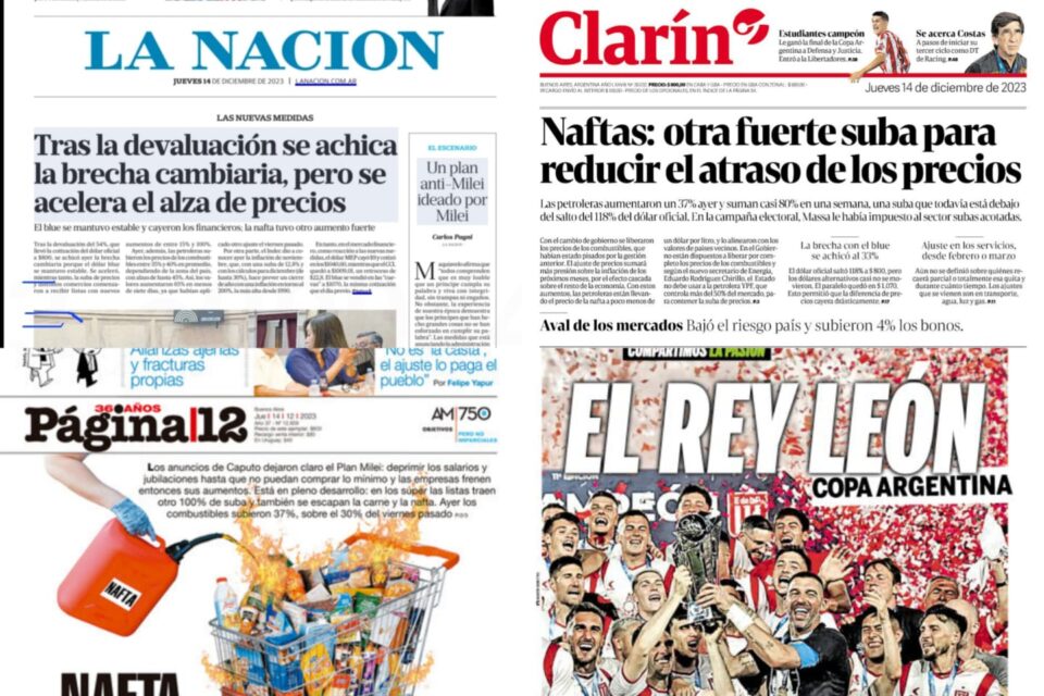 Tapas de los principales diarios nacionales de este jueves 14 de diciembre 14 diciembre, 202314 diciembre, 2023 La Nación Clarín Página 12 Olé