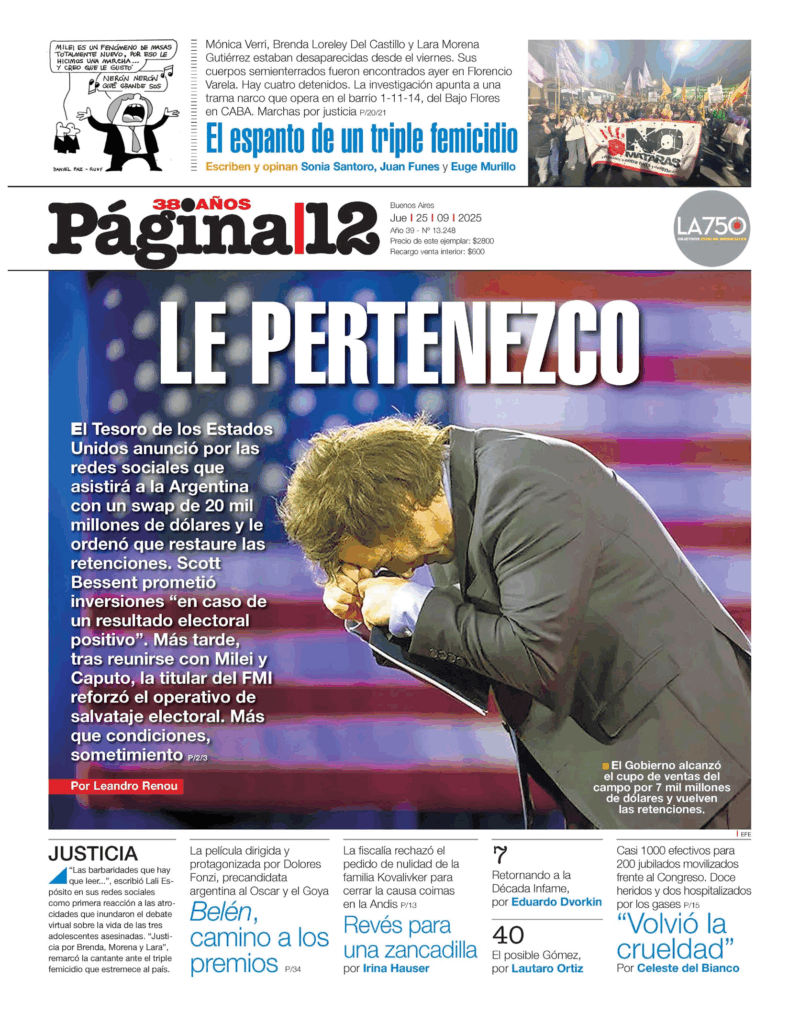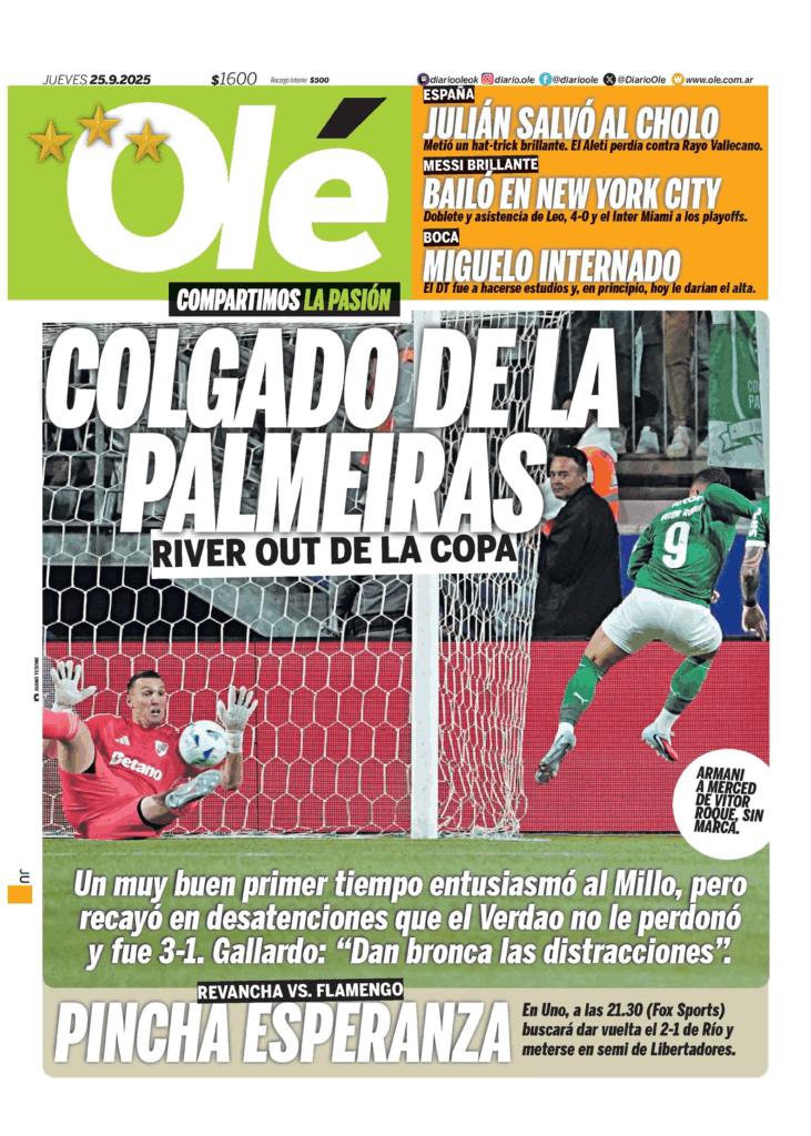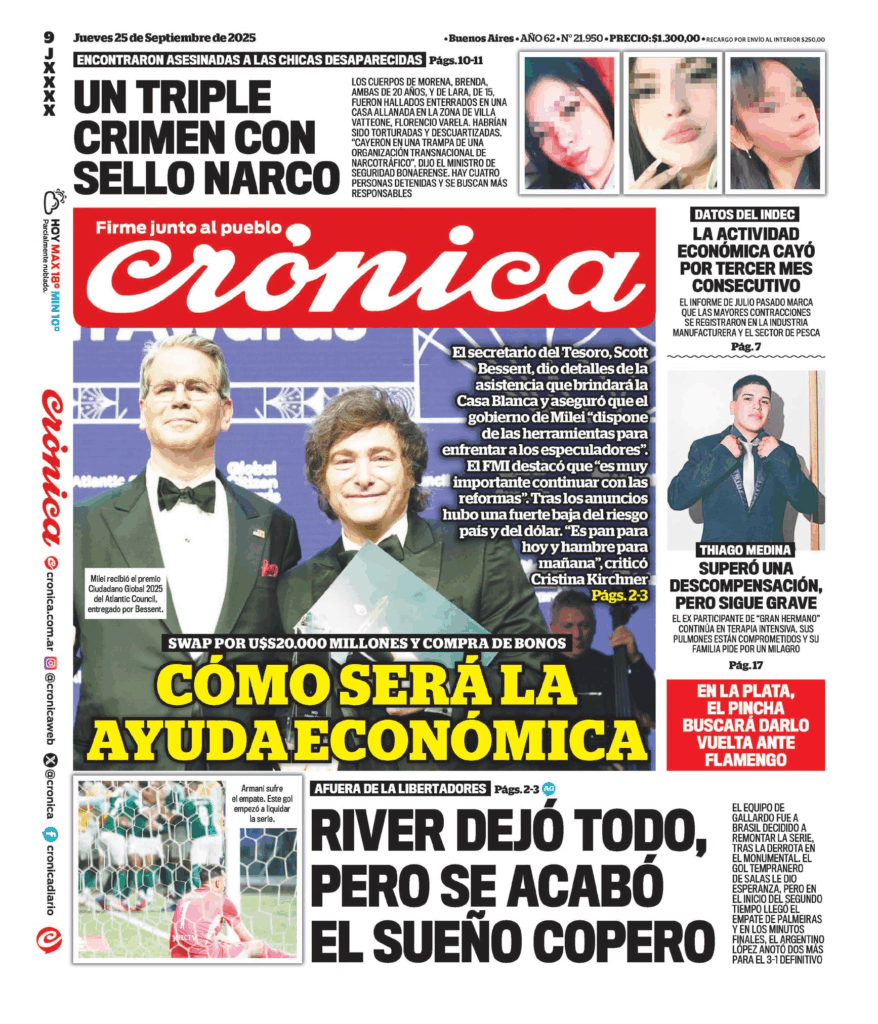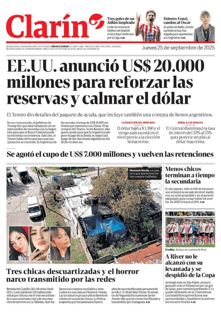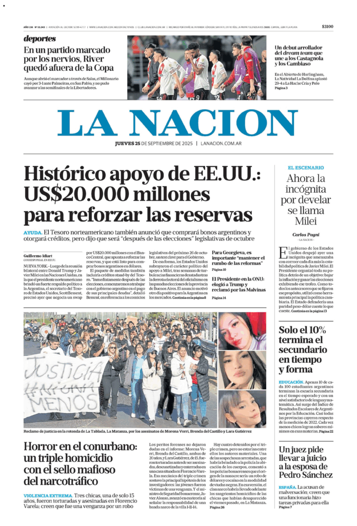 Tapas de los principales diarios nacionales de este jueves 25 de septiembre 25 septiembre, 2025 La Nación Clarín Página 12 Olé Crónica