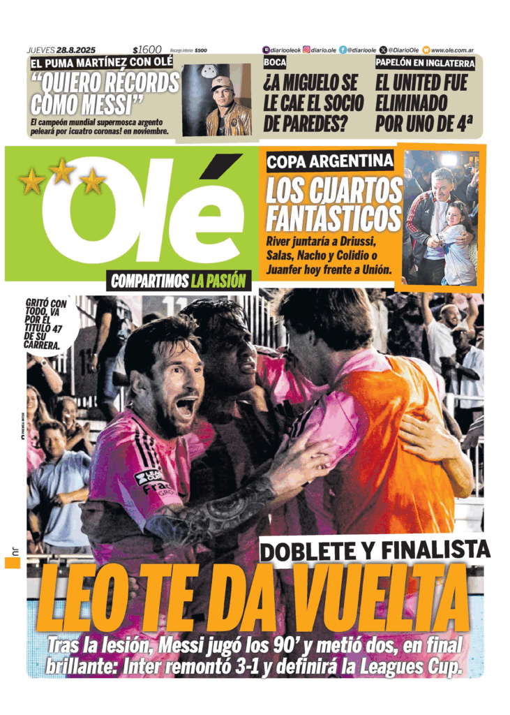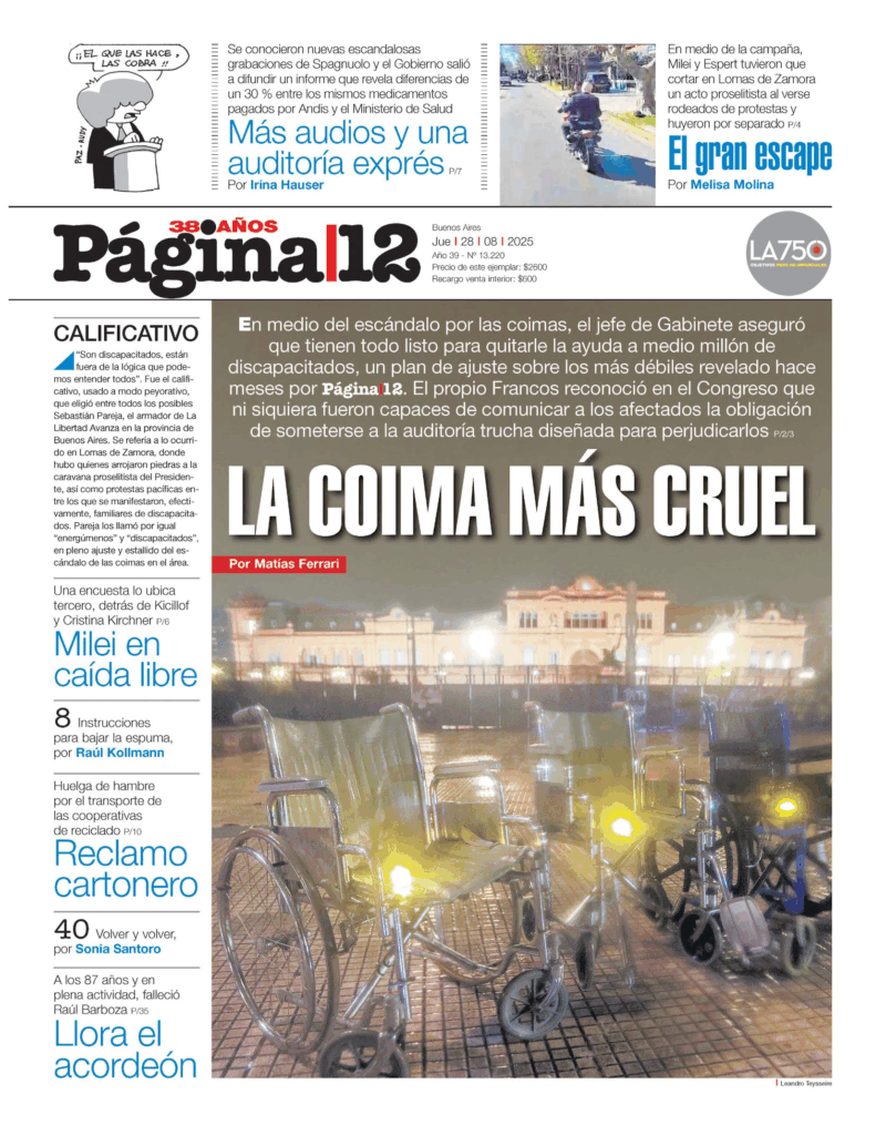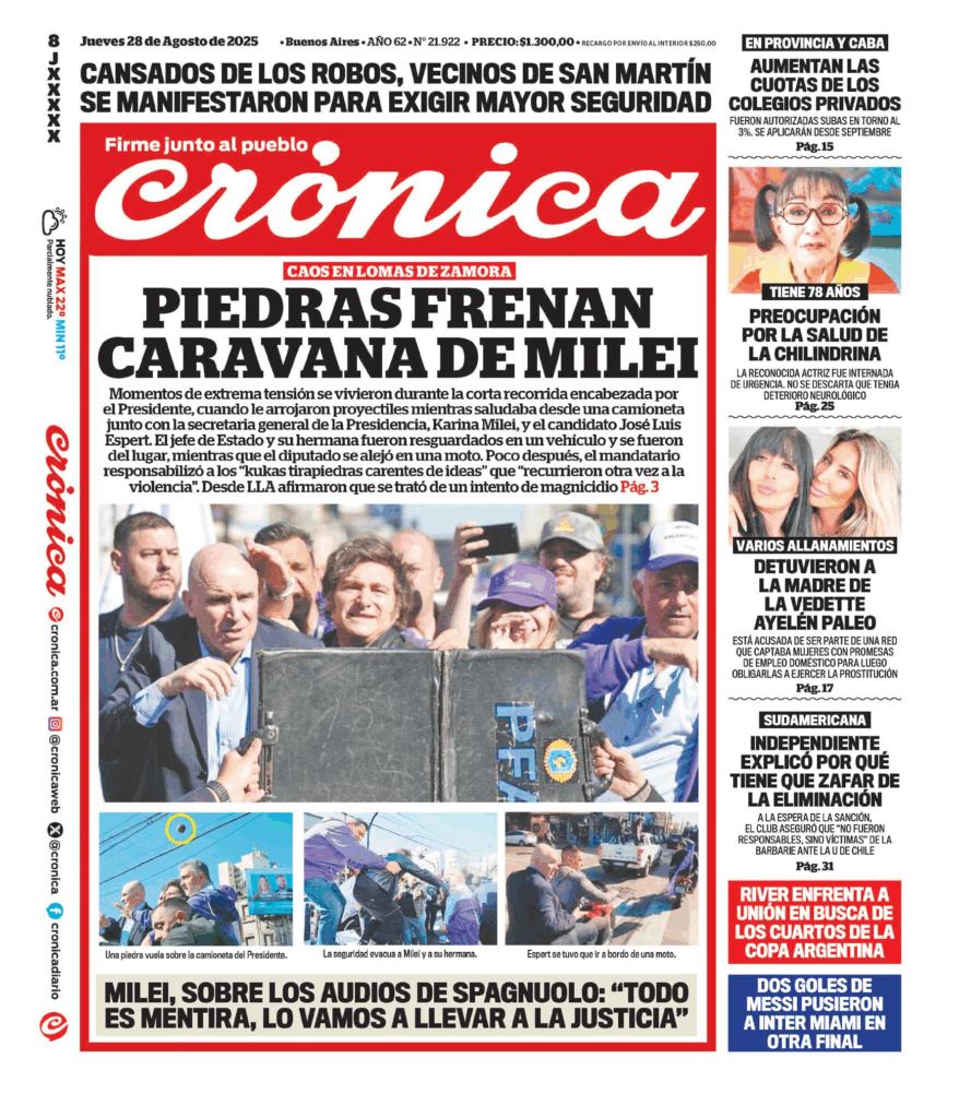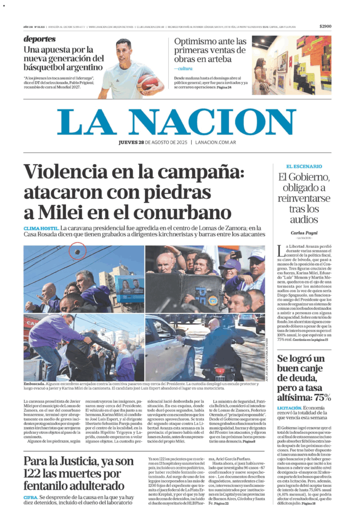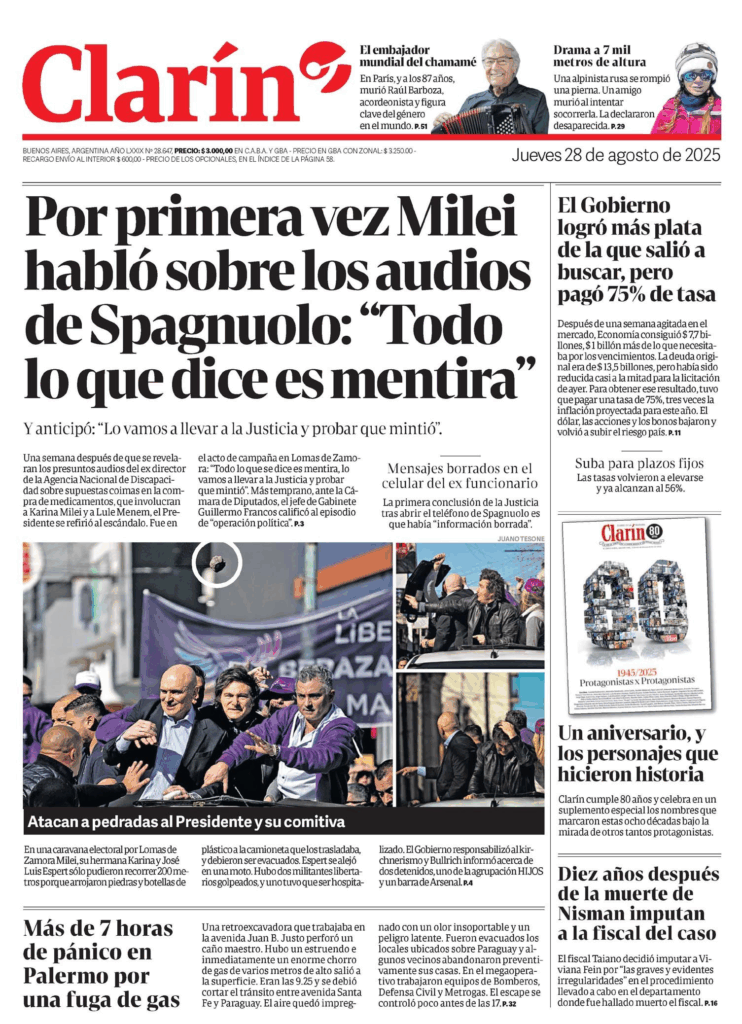 Tapas de los principales diarios nacionales de este jueves 28 de agosto 28 agosto, 2025 La Nación Clarín Página 12 Olé Crónica