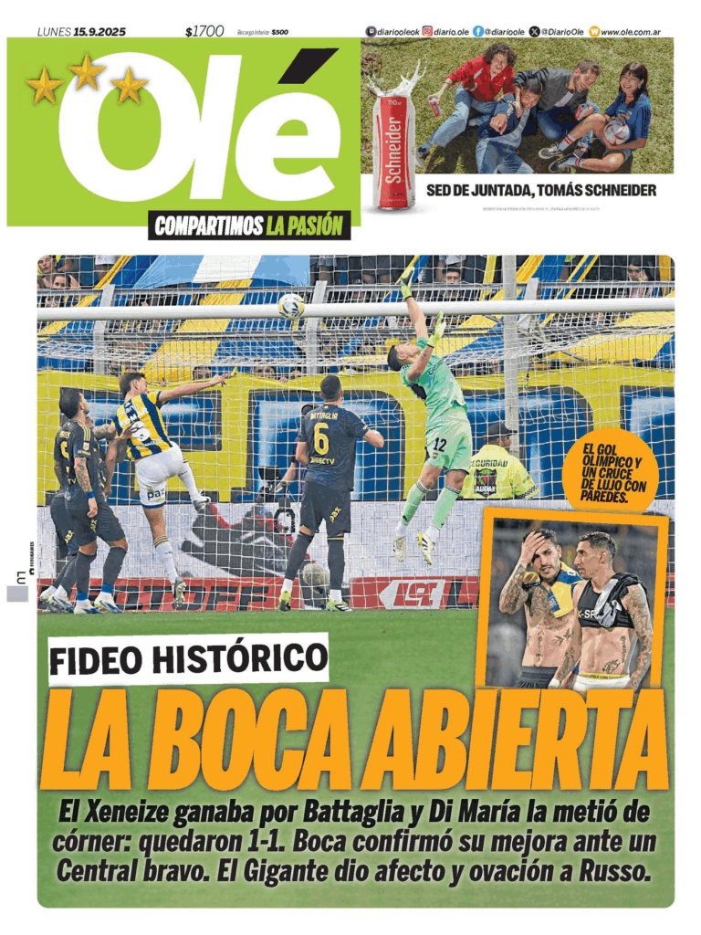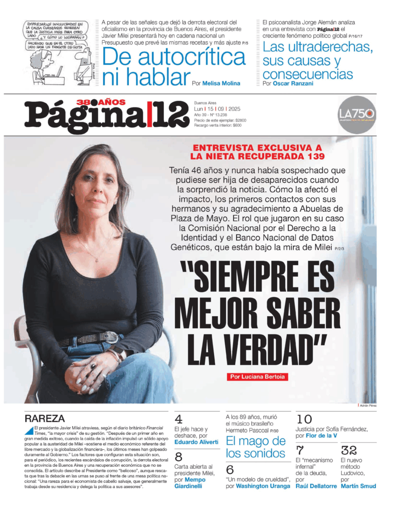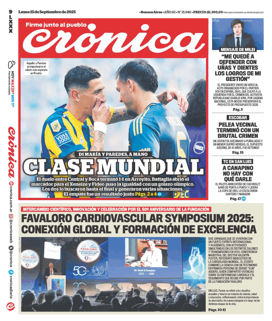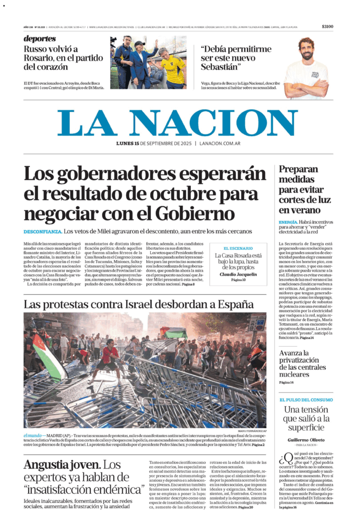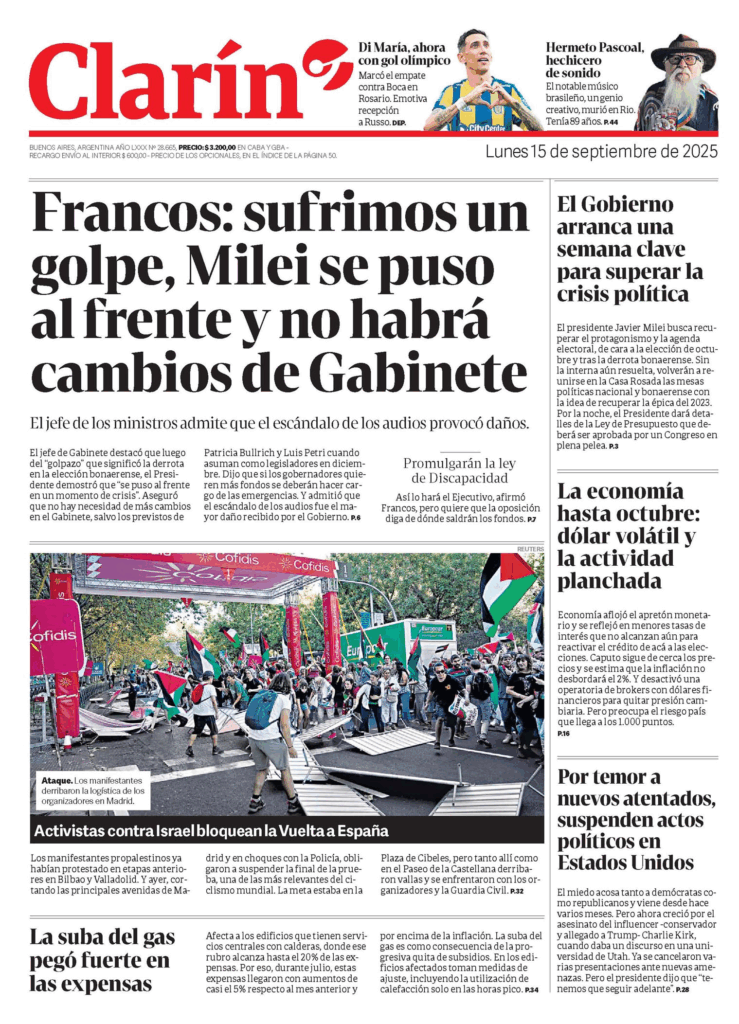 Tapas de los principales diarios nacionales de este lunes 15 de septiembre 15 septiembre, 2025 La Nación Clarín Página 12 Olé Crónica