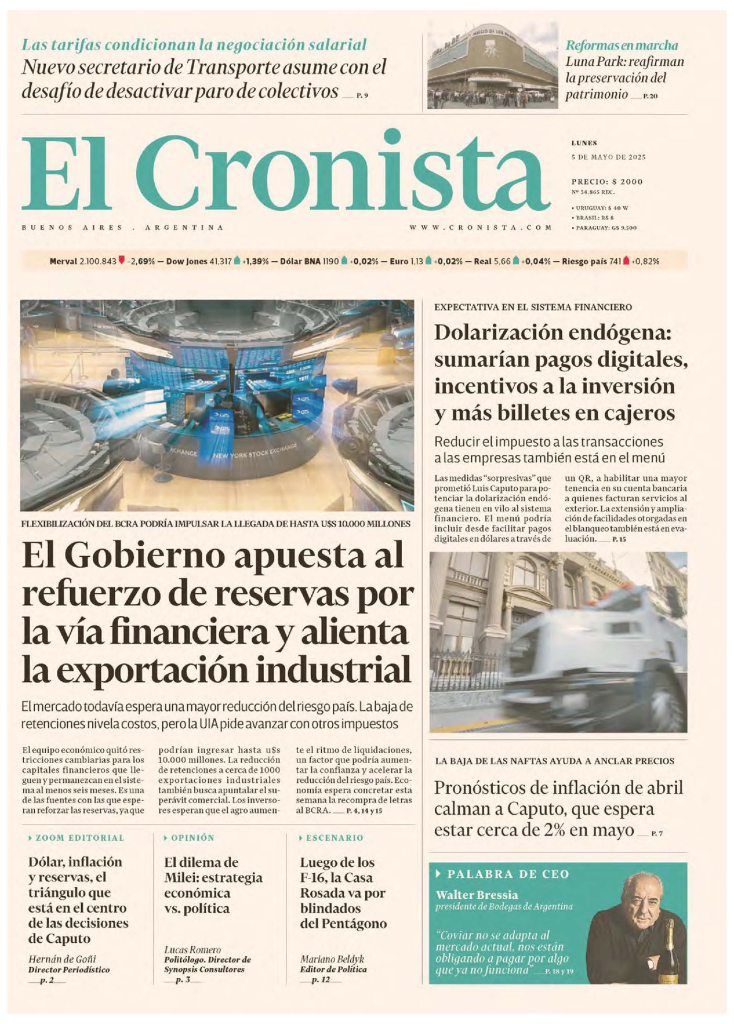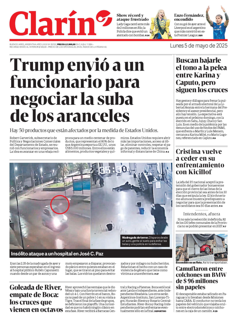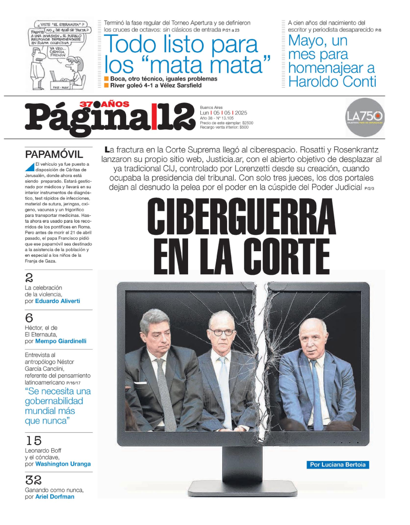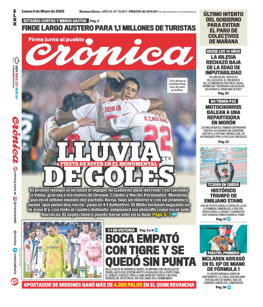 Tapas de los principales diarios nacionales de este lunes 5 de mayo 5 mayo, 2025 La Nación Clarín Página 12 Olé Crónica El Cronista