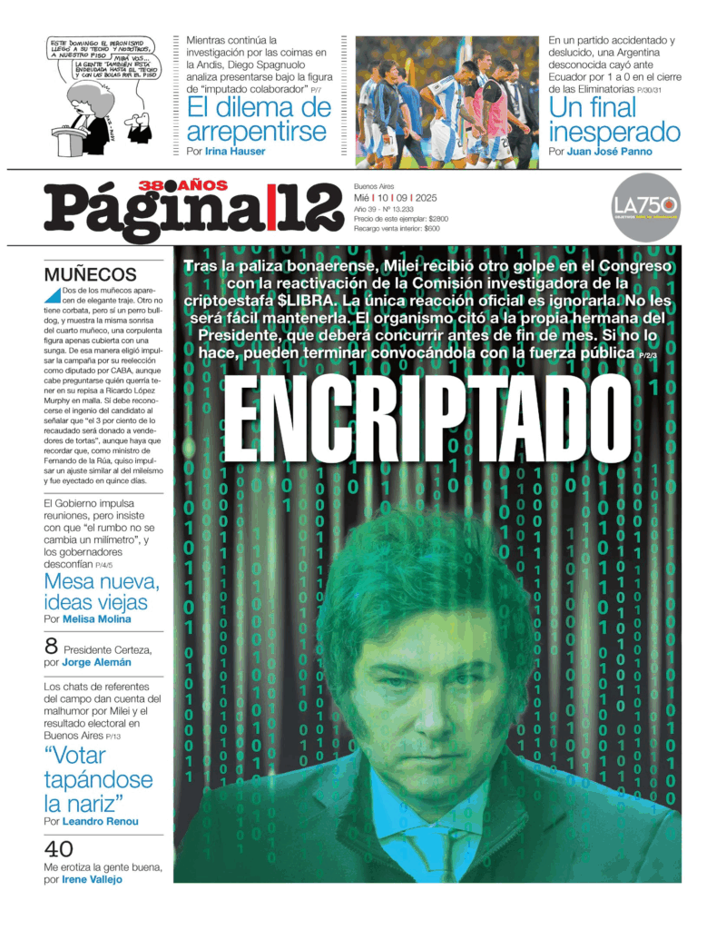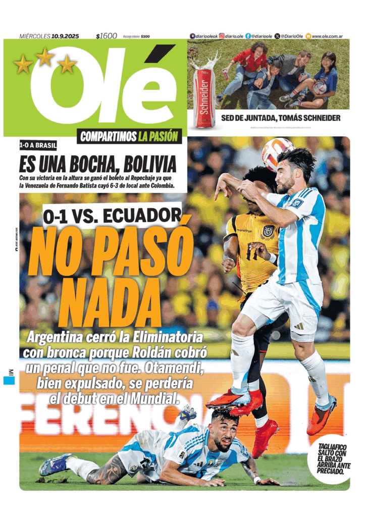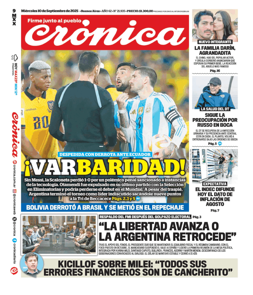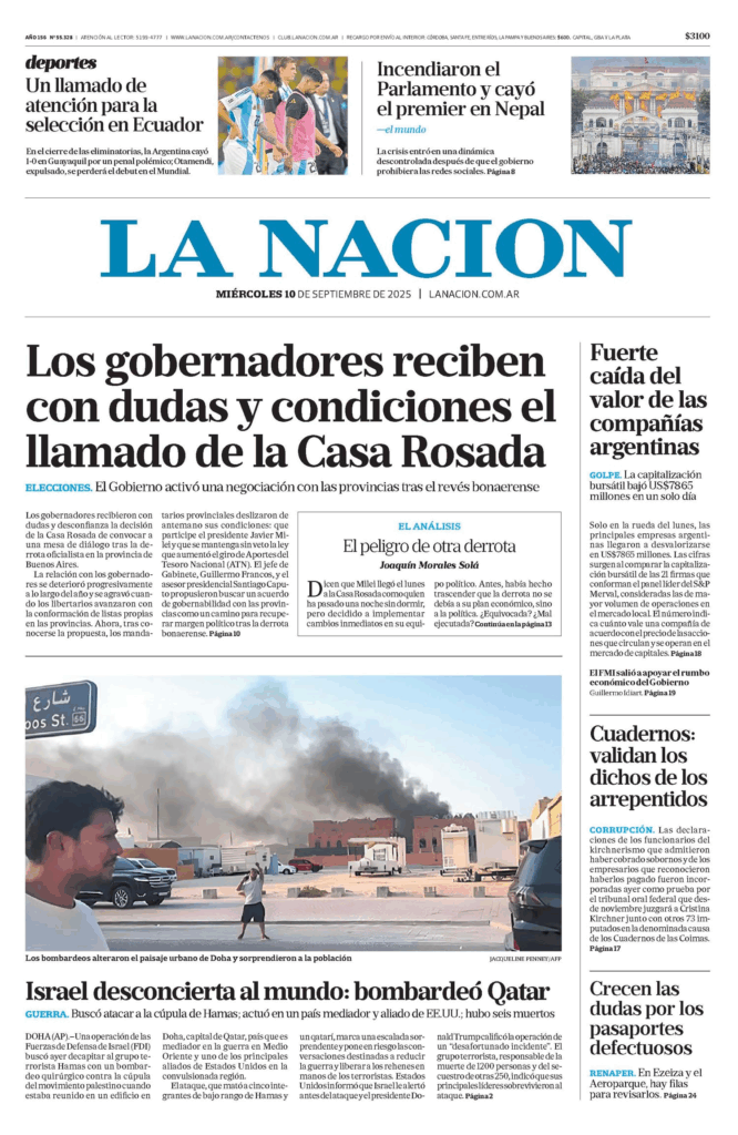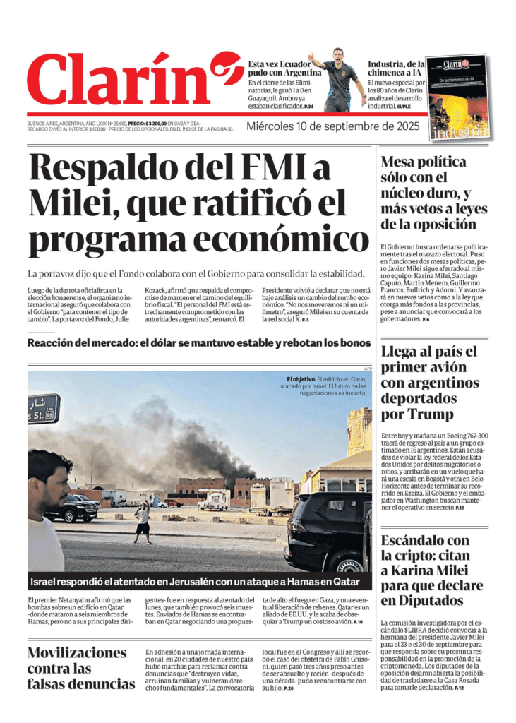 Tapas de los principales diarios nacionales de este miércoles 10 de septiembre 10 septiembre, 202510 septiembre, 2025 La Nación Clarín Página 12 Olé Crónica