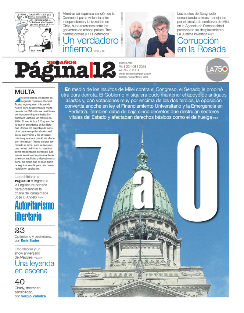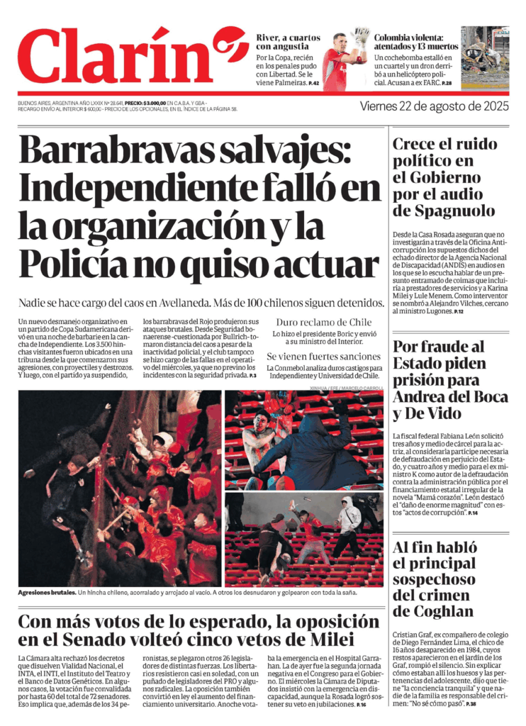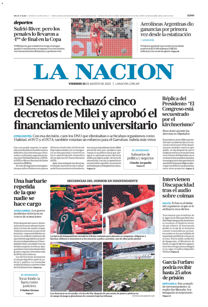 Tapas de los principales diarios nacionales de este viernes 22 de agosto 22 agosto, 2025 La Nación Clarín Página 12 Olé Crónica