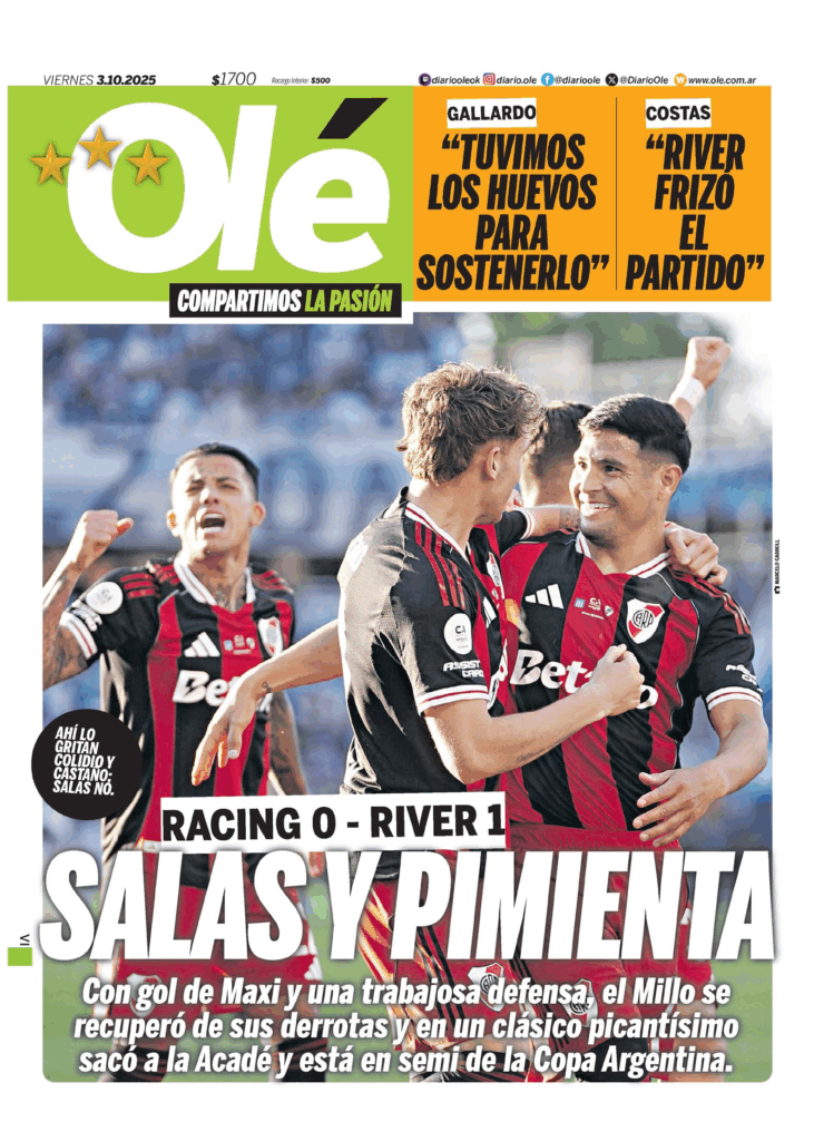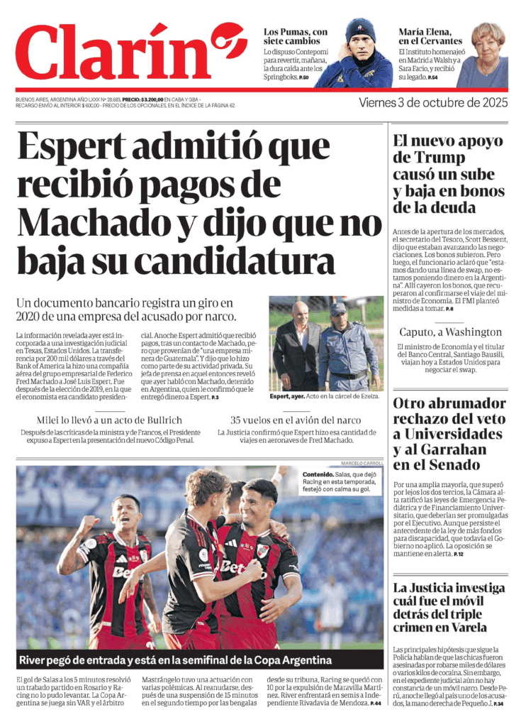 Tapas de los principales diarios nacionales de este viernes 3 de octubre 3 octubre, 2025 La Nación Clarín Página 12 Olé Crónica