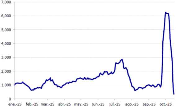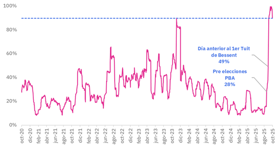 Otra manera de verlo es con este gráfico tan elocuente elaborado por Francisco Mattig, que mide la volatilidad en el precio del bono AL30. La volatilidad suele ser asociada a mayor incertidumbre y/o riesgo. Como pueden ver, en estos días se alcanzó el nivel más elevado de los últimos 5 años, superando al pico anterior que se dio, precisamente, justo antes del ballotage entre Sergio Massa y Milei. Parece difícil de argumentar que, en la previa a una elección de medio término, el riesgo “kuka” sea mayor que en la previa de un ballotage (donde, además, la mayoría de las encuestas daba a Massa como ganador).