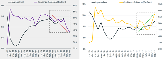 El otro dato sumamente interesante que advierte el informe, es la correlación que se observa entre la evolución del ingreso de la gente y el índice de confianza en el gobierno que publica la Universidad Di Tella (índice que, a su vez, correlaciona muy bien con la intención de voto del oficialismo). Al analizar esas dos variables de manera conjunta y comparándolas con las elecciones de medio término de Cambiemos (que, por sus votantes y sus características en la gestión se asemeja más a las de Milei), la gran diferencia que se observa es que Mauricio Macri llegó a esas elecciones con el ingreso y el índice de confianza al alza (luego ganaría las elecciones). En cambio, Milei llega con el ingreso y el índice de confianza a la baja.