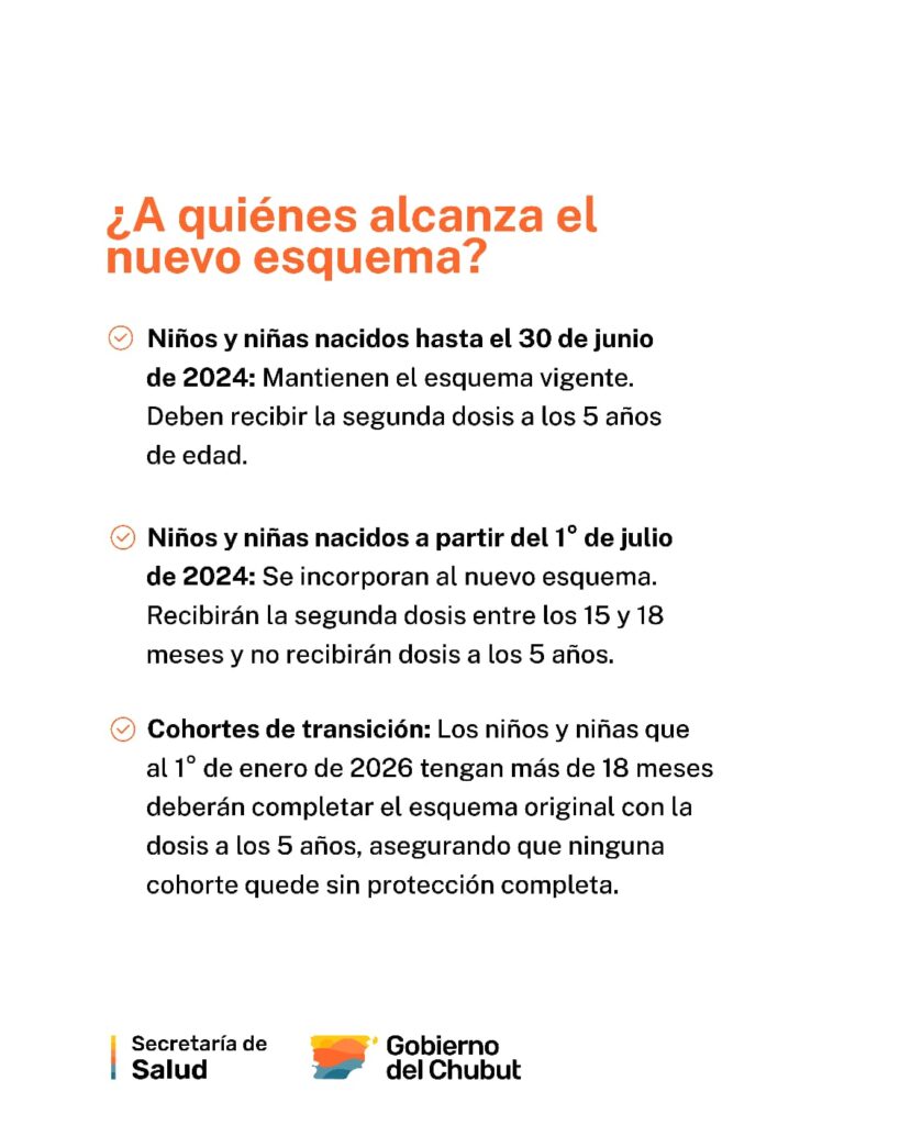 Niños y niñas nacidos hasta el 30 de junio de 2024, mantienen el esquema vigente a diciembre de 2025. Deben recibir la segunda dosis a los 5 años de edad.