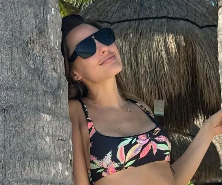 ¿Los detalles del look veraniego? La actriz posó apoyada sobre una palmera con un traje de baño de dos piezas con estampa de hojas en colores flúo. El corpiño es estilo top deportivo con escote recto. La parte de abajo, en tanto, es diminuta, colaless y tiene breteles regulables.